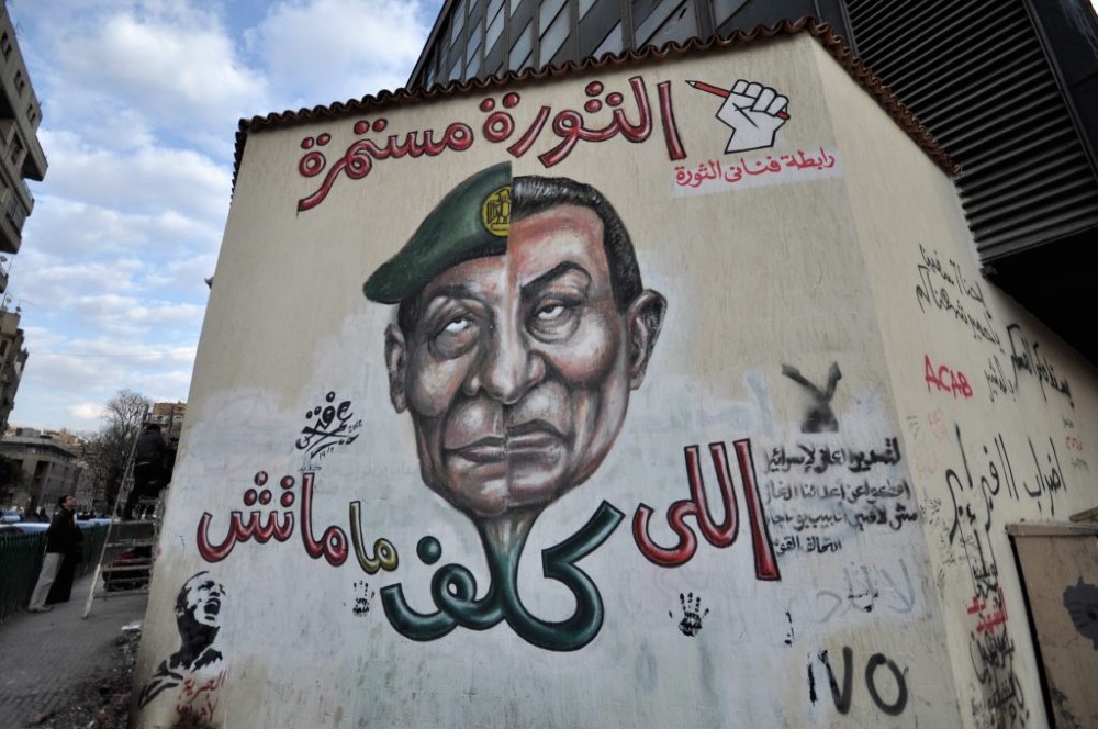 Yarı Mübarek, Yarı Tantavi. Ömer Fethi tarafından Kahire’nin Tahrir Meydanı’na çizilmiş bir duvar resmi. (Mart 2012)
